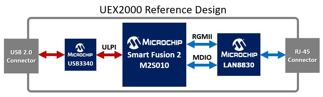 Układy FPGA SmartFusion®2 SoC firmy Microchip (M2S010) zapewniają niezawodne rozszerzenie USB 2.0 poprzez standardowe okablowanie Ethernet dla rozwiązań ekspanderów USB UEX1000 i UEX2000 firmy Semtech. Referencyjne jednostki projektowe i ewaluacyjne prezentują kompleksowe rozwiązanie systemowe (TSS) firmy Microchip z interfejsem ULPI PHY USB3340 i Ethernet PHY LAN8830 o potrójnej prędkości, a także kontrolerem USB-Ethernet LAN7800 dostępnym dla projektów SuperSpeed. Rozwiązania te są szeroko stosowane w profesjonalnych systemach AV, przemysłowych systemach sterowania i automatyzacji produkcji, gdzie niskie zużycie energii, wydajność i długotrwała niezawodność mają kluczowe znaczenie.